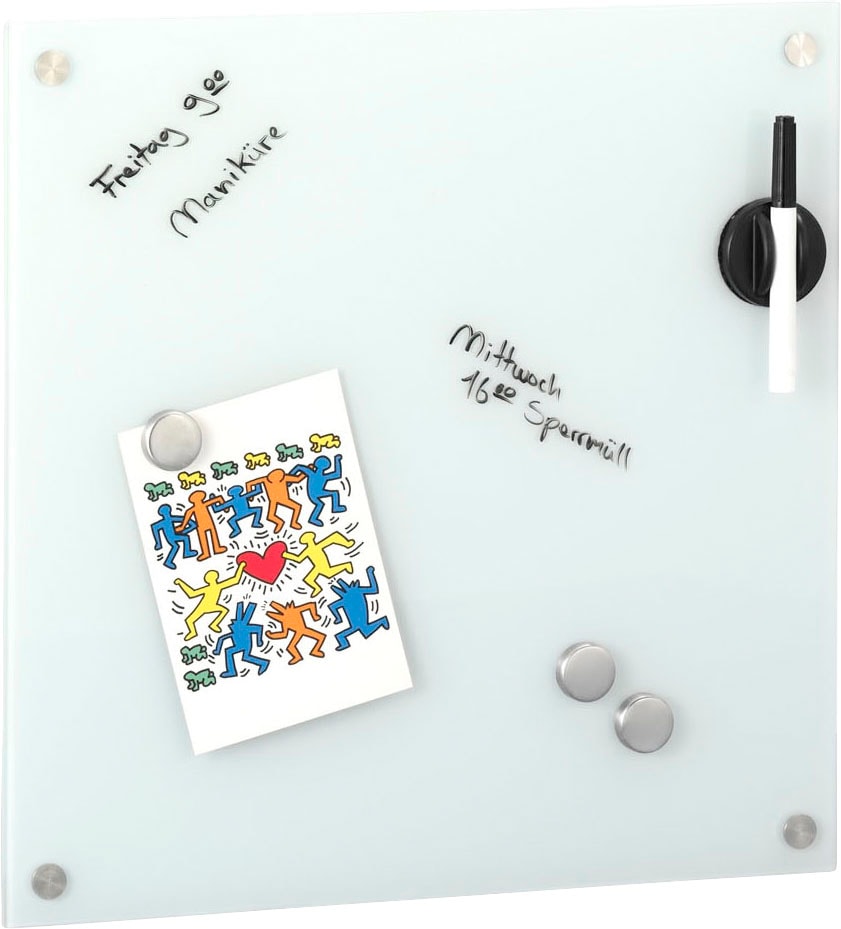 Die Lieferung des Memoboards umfasst praktisches Zubehör, das für noch mehr Funktionalität sorgt. Dazu gehören zwei Stiftehalter, die es Ihnen ermöglichen, stets griffbereit zu sein, sowie fünf Magnete für Ihre wichtigsten Notizen.